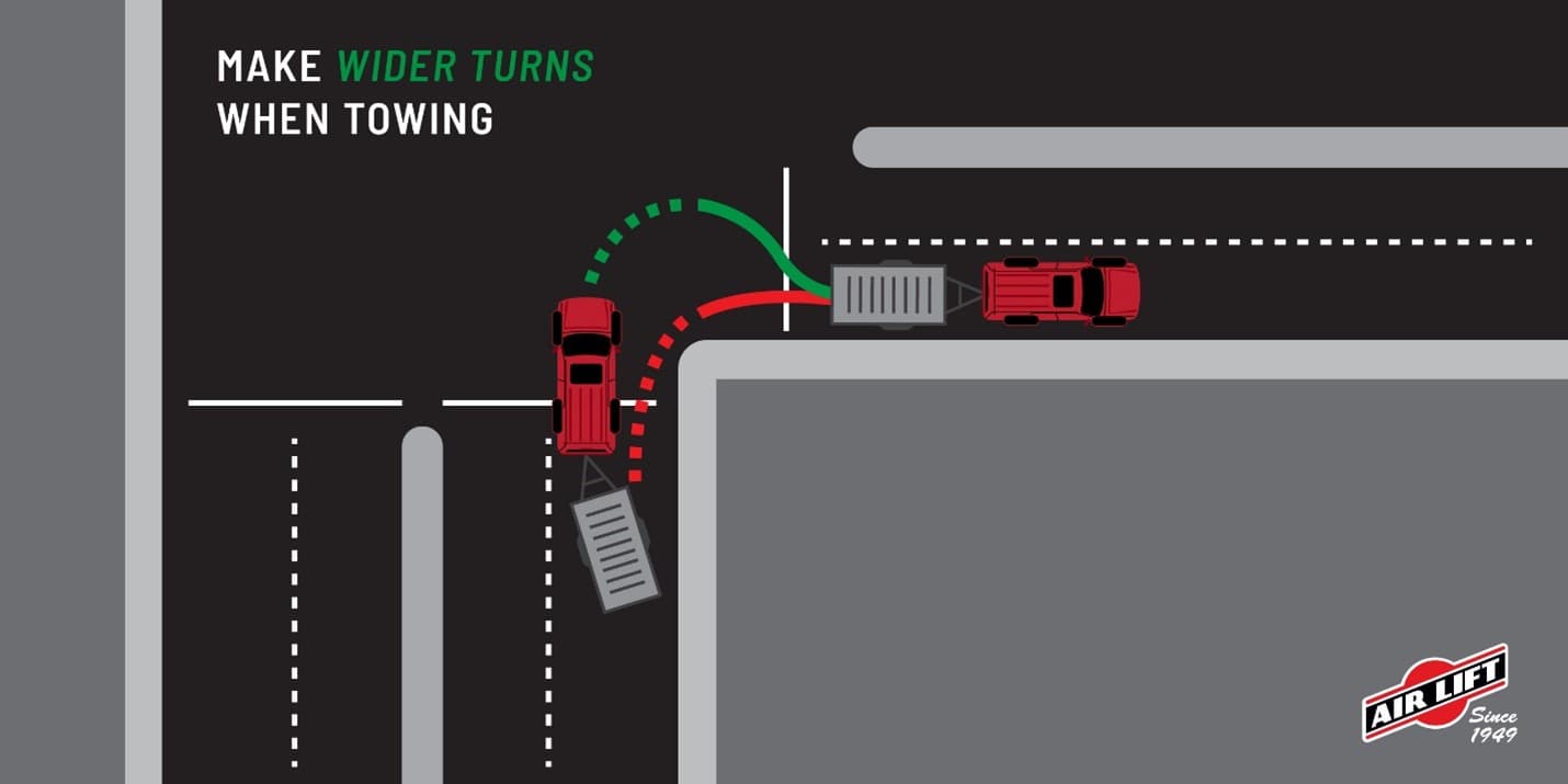 When you tow a trailer behind you, you increase the overall length your vehicle must travel to make the turn and clear your now-elongated wheelbase. If you cut the turn to tight, your trailer will likely hit the curb or take someone’s mailbox with it.